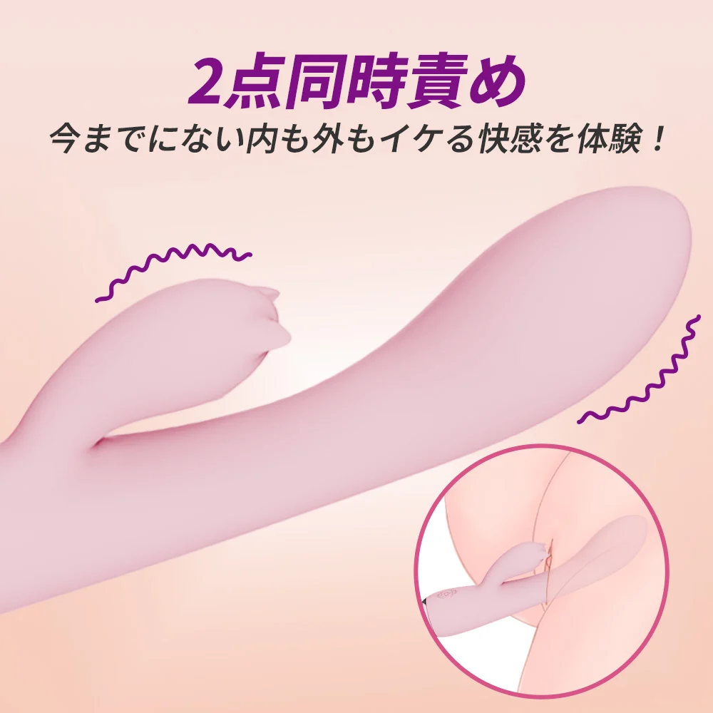 Fanny二点責め電動バイブ、クリ責めの部分は耳と鼻があって可愛い小動物みたいな外形、そしてバイブの大部は少女感満々のピンク色、使う時の抵抗感が薄い。その可愛い見た目の下にひそめているのは凄まじい振動力、Gスポットだけじゃない、クリまでその強振でいっちゃう。