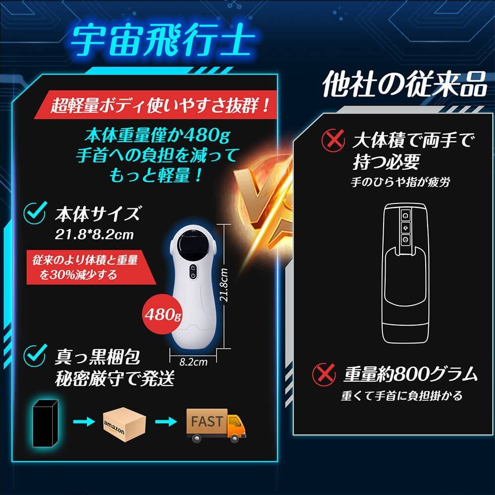 • 【片手でも持ちやすい超軽量と音声機能搭載】超軽量の特別なデザイン、片手でも持ちやすい仕様です。本体サイズは82*218mm、正味重量480g、従来のカップよりも重量と体積が40%減少し、手首や腕への負担を大幅に軽減し、より簡単で便利に使用できます!宇宙飛行士のようなクールな外観デザインと滑らかなボディラインは、収納時もインテリアとしても映えます! 音声機能付きでヘッドホンも同梱されているので、プライバシーを守りながら楽しめます!